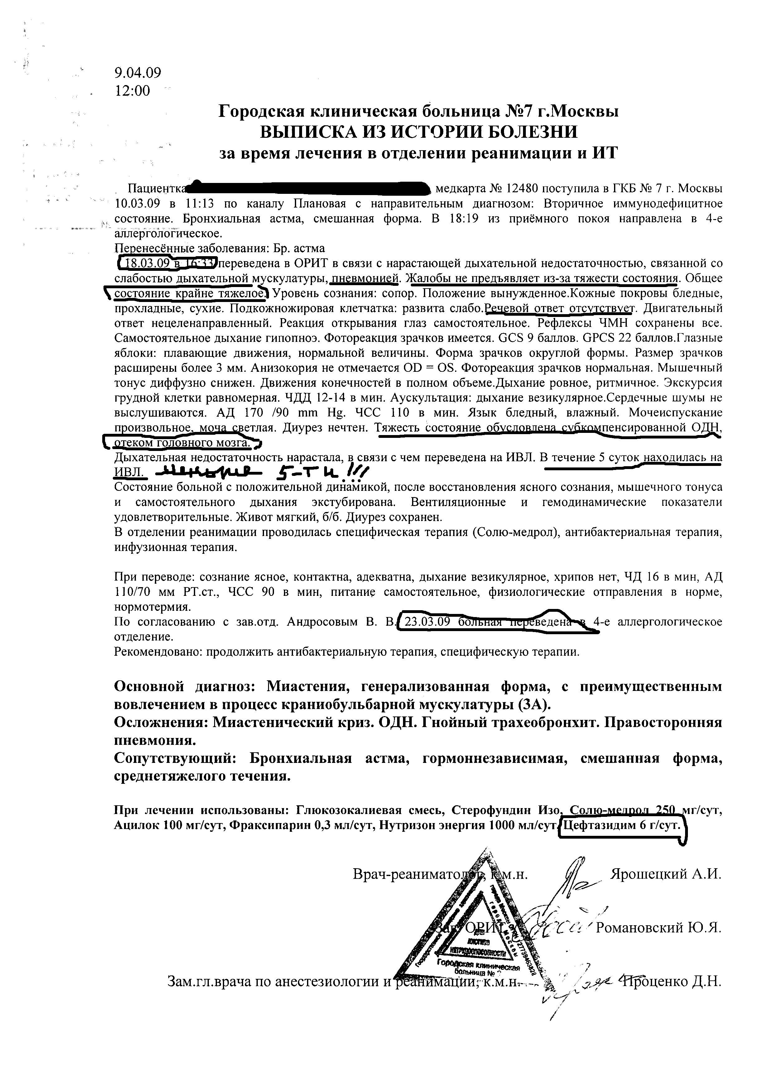 Находилась с 10.02.2011 по 03.03.2011 с внегоспитальной пневмонией на истязаниях в ГКБ № 54 г. Москвы. Все действия производимые надо мною там садистами в белых халатах были насильственны и крайне мучительны. Никакого добровольного информированного согласия на лечение я не подписывала, меня об этом даже никто не просил, ограничившись тем, что получили его от моей мамы, воспользовавшись её на тот момент шоковым состоянием. Разумеется, никто ни о чём её не информировал вообще и даже не собирался. Сама я была в полном сознании практически каждый мой день довольно тяжёлых тех для меня истязаний, едва не закончившихся смертью моей из-за наступивших тяжких последствий – угрозы жизни из-за пневмоторакса, бывшего результатом также насильственно проведённой совершенно ненужной мне операции – трахеостомия. Покинула я сие заведение на инвалидной коляске с анемией средней степени тяжести, в практически предельном уже истощении, подобная жертве Освенцима, к тому же со множество шрамов, дырою в трахее. Мне был причинен существенный моральный и физический вред, т.к. не только непосредственно до поступления туда, в ту больницу со мной не было подобного ничего, но и вообще ещё ни разу в жизни моей!!! На момент поступления я была, фактически, на ногах и гемоглобином в крови даже выше, чем норма. Ещё сутки дышала сама, в ИВЛ не нуждалась. Но т.к. лечения не было, а были лишь истязания, на второй день уже дышать не смогла, потребовалась интубация и подключение к аппарату искуственной вентиляции лёгких. Обо всё этом подробнее рассказывать долго и нудно, брошу просто несколько ссылок: